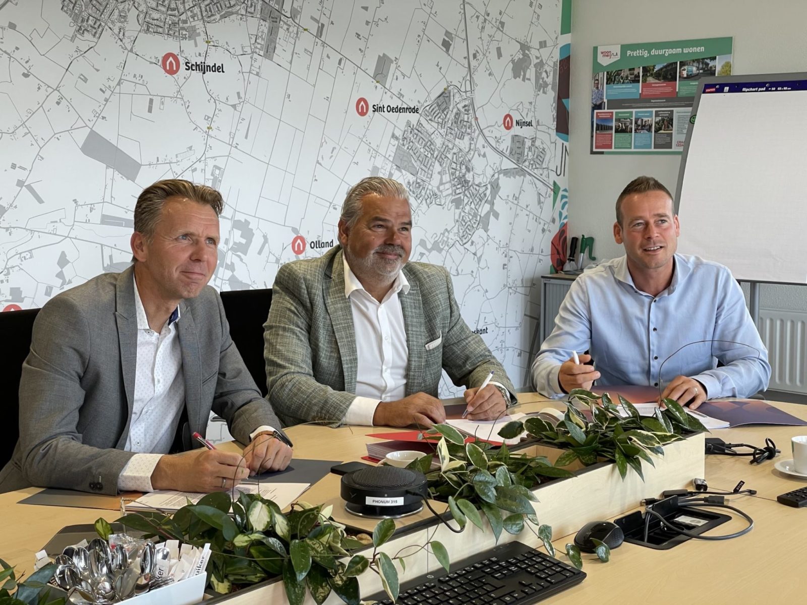 Woningcorporatie Woonmeij, Okko projectontwikkeling en Hoedemakers tekenden gisteren de aannemingsovereenkomst voor de realisatie van 56 duurzame woningen aan de Eerschotsestraat in Sint-Oedenrode.